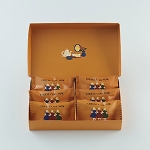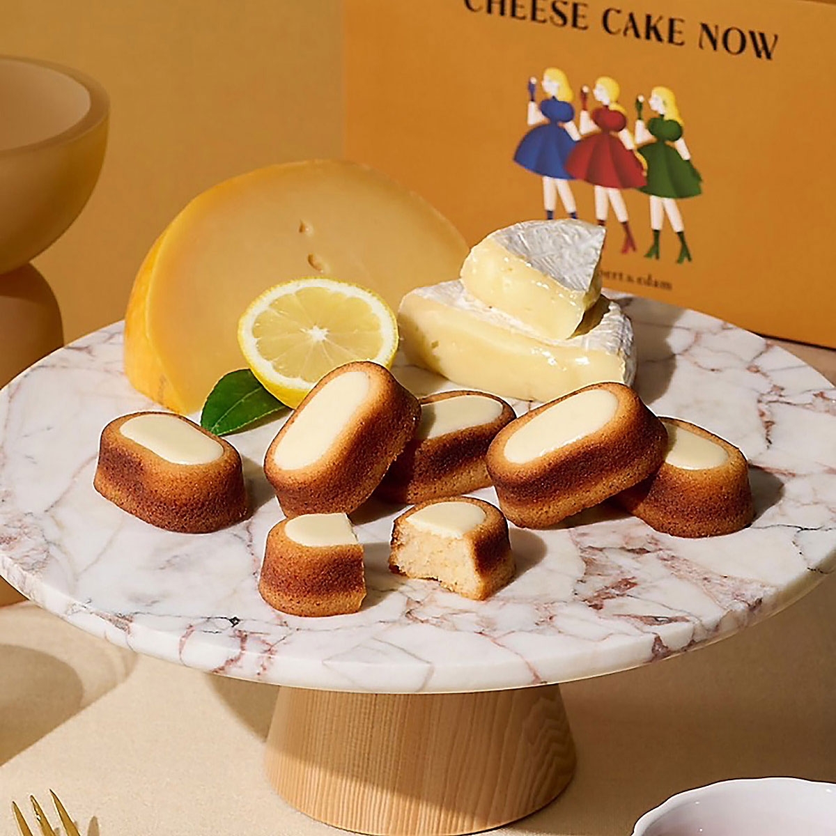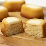 カマンベールチーズとエダムチーズにほんのりレモンをきかせて仕上げたしっとりケイク生地に、2種のチーズを練りこんだチョコレートでおめかし。クラシックなチーズケーキをイメージでつくり、かわいらしいフォルムのお菓子に仕上げました。