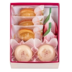 さくらんぼをまるごとひとつ使用した「花桜桃」、白桃の果肉入りの「白桃プリン」、アーモンドの芳香とコクのあるバターの風味を生かした「白桃フィナンシェ」。3種類の和菓子の詰合せです。