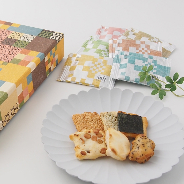 伝統工芸・寄せ木工細工をアレンジしたモダンなパッケージはカジュアルながら高級感があり、中には一口サイズのおかきを6種類詰合せました。お召し上がりやすく母の日のギフトにお勧めです。
