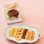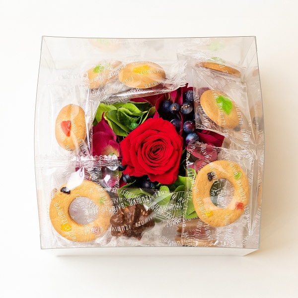 プリザーブドフラワーとアーティフィシャルフラワーが入ったケースに、泉屋人気クッキー“プチ”リングターツや花びらのような一口サイズのクッキーを散りばめたギフト商品です。