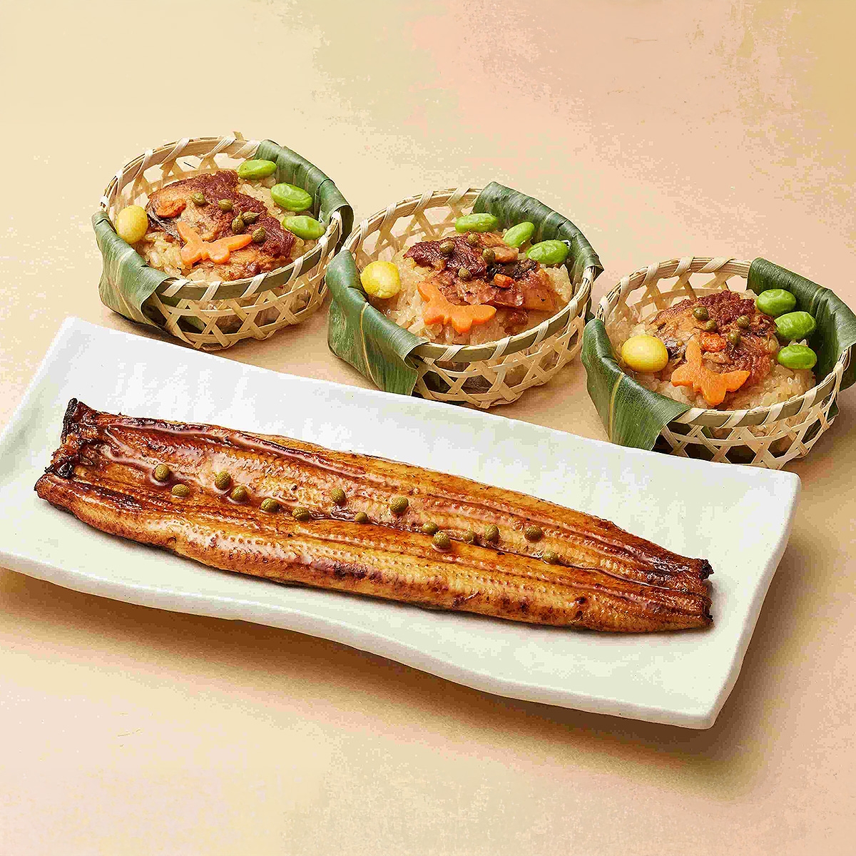 鰻蒲焼(130g×1尾、タレ、実山椒)、鰻の飯蒸し(100g×3個)