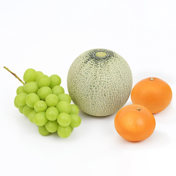茨城県産他メロン 1玉(約1.0kg)、山梨県産他シャインマスカット 1房(約400g)、アメリカ産他オレンジ 2玉(計約300g)