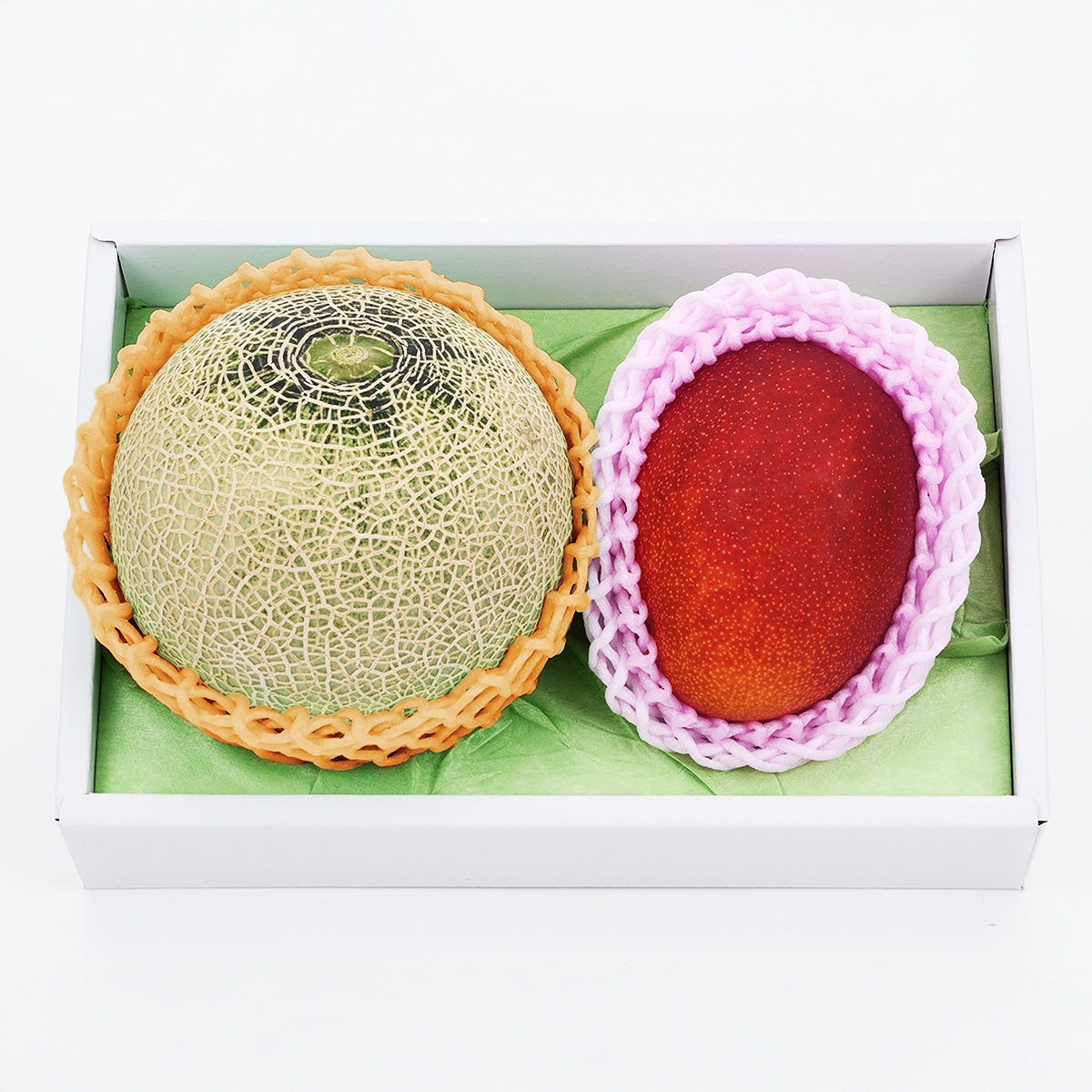 宮崎県産完熟マンゴー1玉(約310g)、茨城県産他赤肉メロン1玉(約1.0kg)