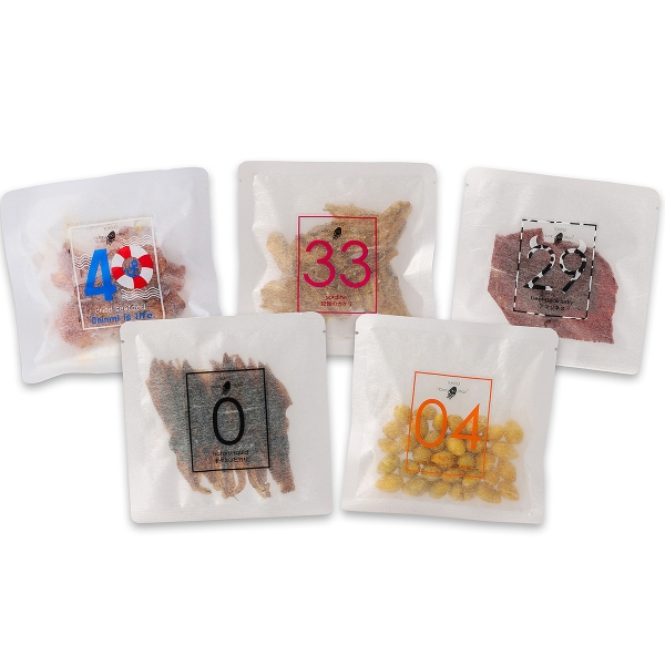 No.0 ホタルノヒカリ(ほたるいかいしり干し)、No.04 上空10メートルの贈り物(塩ぎんなん)、No.29 アマゾネス(ビーフジャーキー)、No.33 記憶のカケラ(いわしせんべい)、No.40 Chinmi is life.(白焼きいか軟骨燻製)各1個