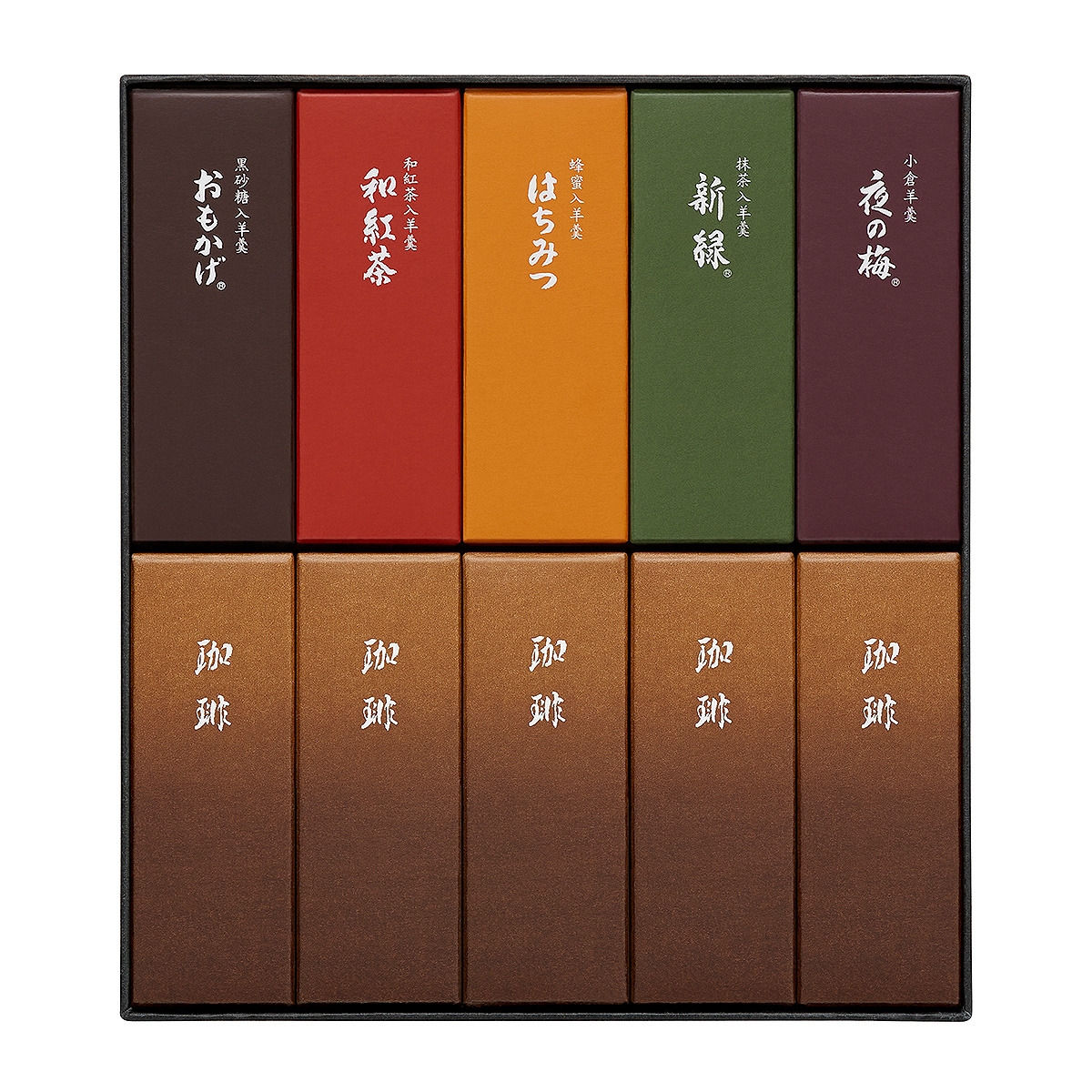 小形羊羹『珈琲』(50g)×5本、小倉羊羹『夜の梅』、抹茶入羊羹『新緑』、黒砂糖入羊羹『おもかげ』、蜂蜜入羊羹『はちみつ』、和紅茶入羊羹『和紅茶』(各50g)×各1本