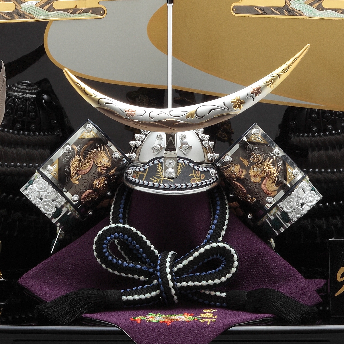 豪華な彫金を施した、高級感ある飾り台と屏風、煌びやかなシルバーの兜に三日月の前立てが映えます。