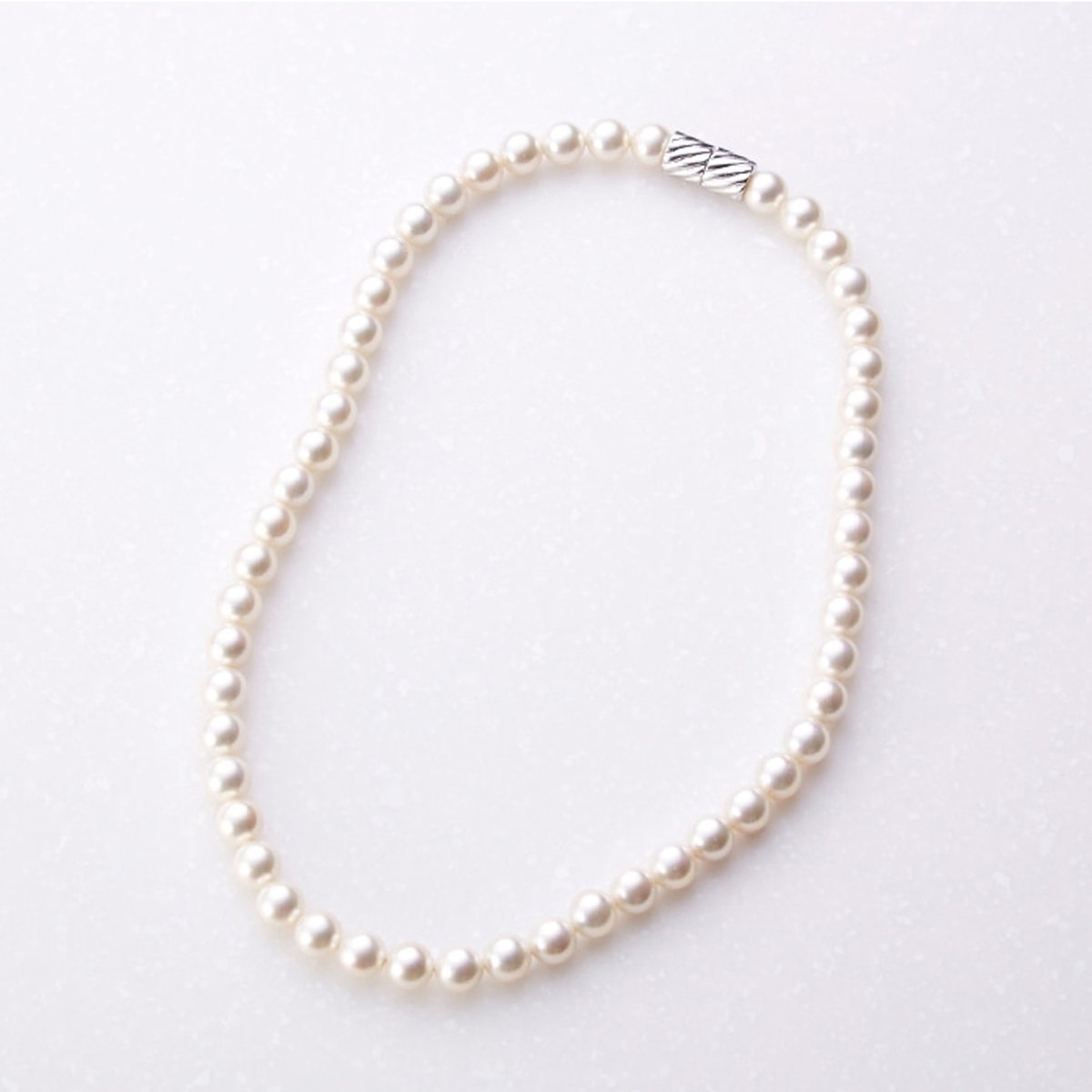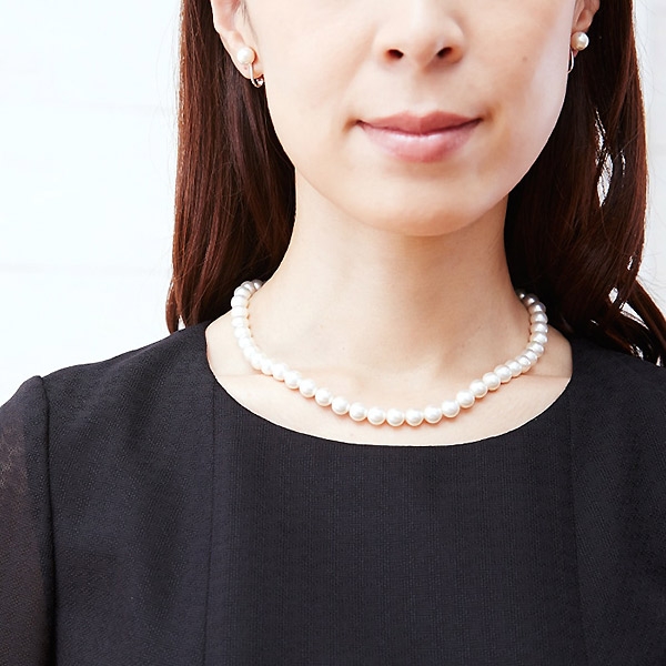 慶弔どちらでもお使いいただけるのは周知のことですが、「人魚の涙」との言われもあり、特に喪のシーンでは哀悼の意をあらわします。しっかり存在感のある8mm玉パールを使用し、よりいっそう装いを引き締めます。マグネット留め具を採用し、スムーズに着脱できるので幅広い年代の方にご愛用いただいています。