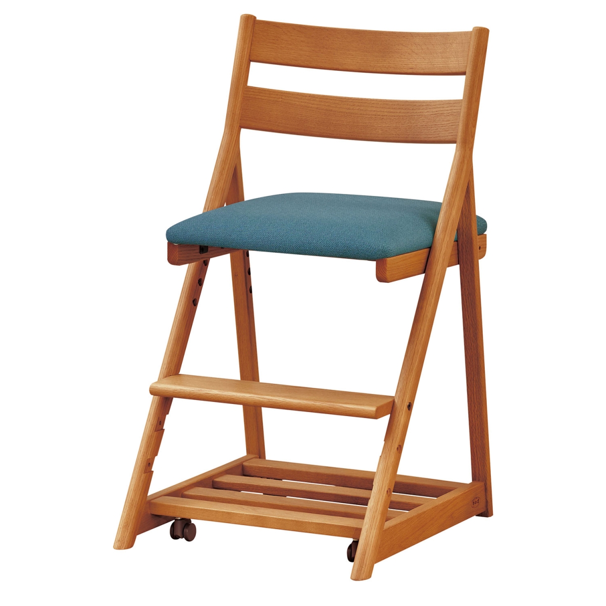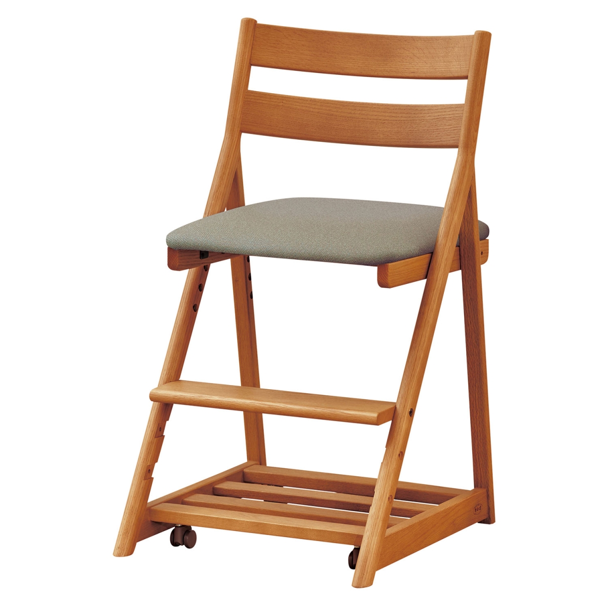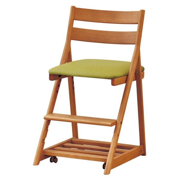 座面は4段階に高さを調節できます。座面の張地はダイニングチェアでも使用している汚れに強い合成皮革よりお選びいただけます。万が一、お子様が汚してもメンテナンスは簡単です。座ると沈み込む安心設計のキャスター付きです。