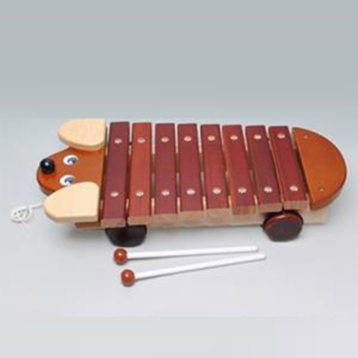 木琴のやさしい音色が響きます。音盤材は本物の楽器と同じ材木を使用し、調律は教育用シロホンと同様の基準音にしてあります。ドから始まる8音階です。美しい音色を出すために、エラストマーリングを巻いたタイヤを付け、音盤を床から離しました。バチは割れにくいプラスチック製で、本体に収納できます。