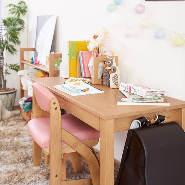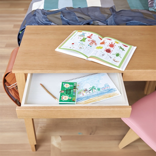 コンパクトなので、リビングなどに置いても場所を取らず、お子様用だけでなく、パソコンデスクとしてもご利用いただけます。天板はキズ、汚れに強いUV塗装で仕上げておりますので安心してご使用いただけます。