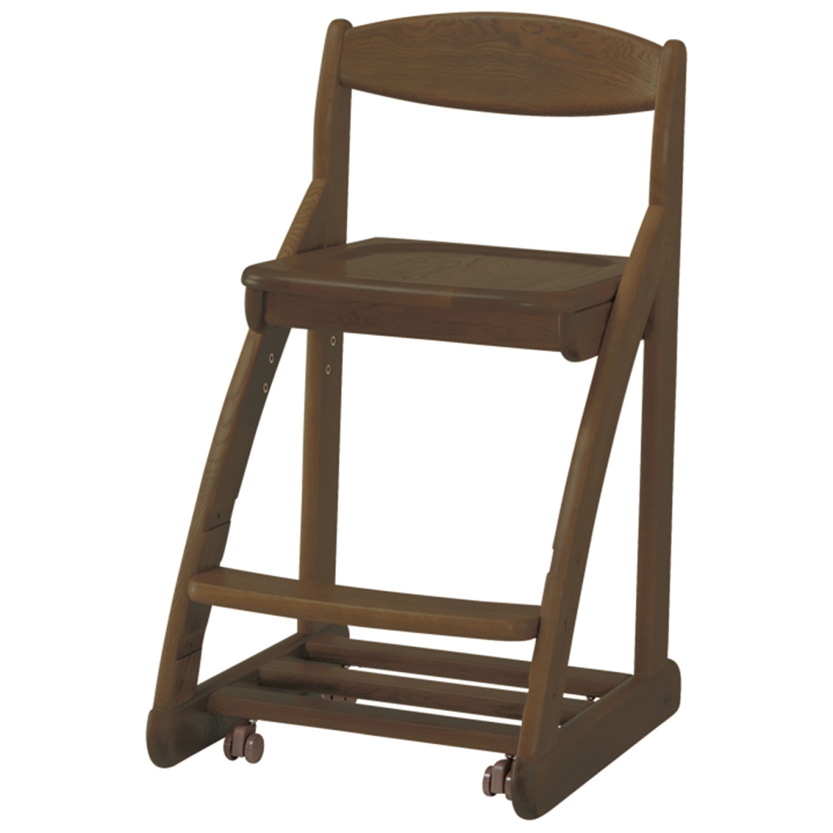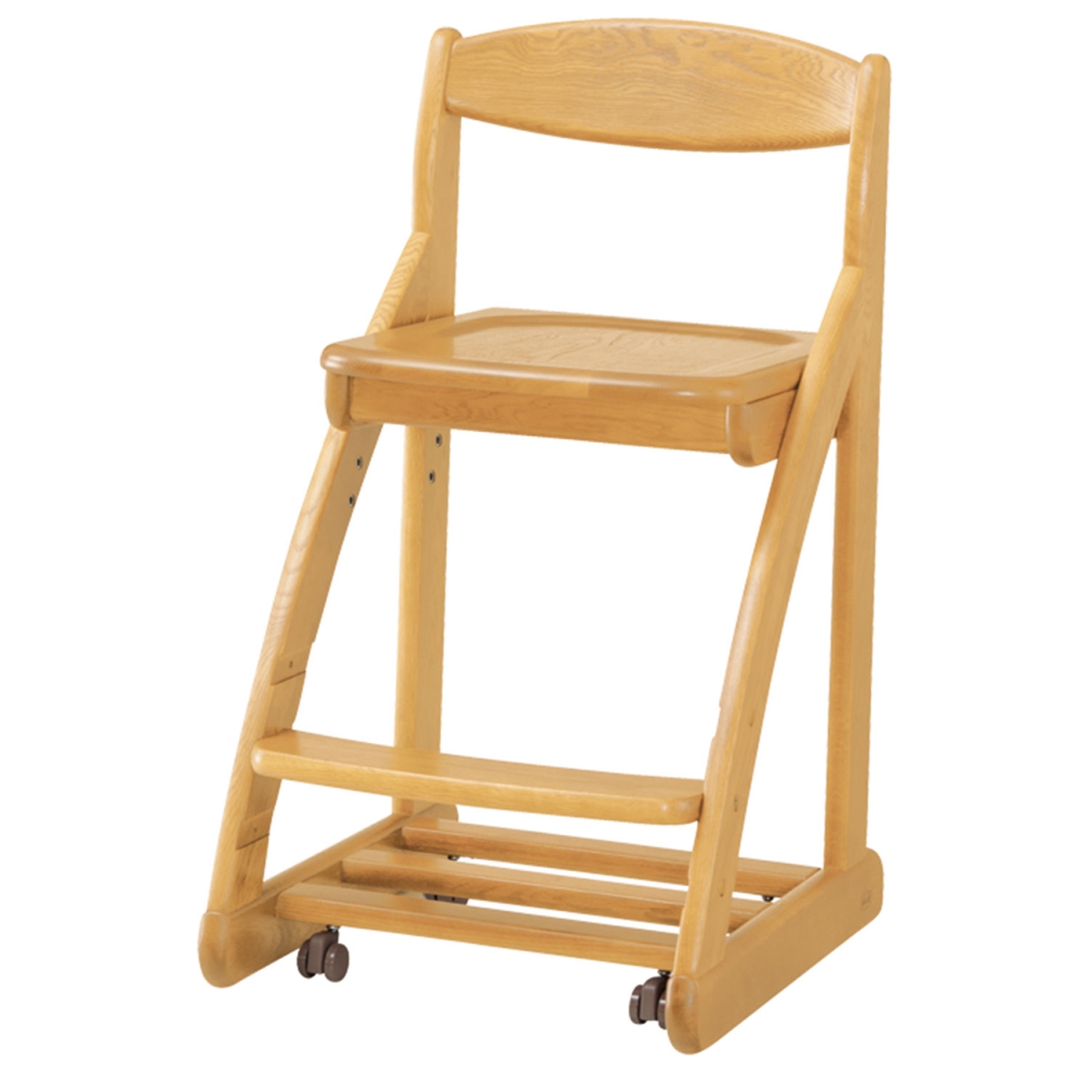 座面は4段階に高さを調節でき、前後にもスライド調節できます。座面は板座のため、張替えなどのメンテナンスが不要。万が一、お子様が汚してもメンテナンスは簡単です。座ると沈み込む安心設計のキャスター付きです。