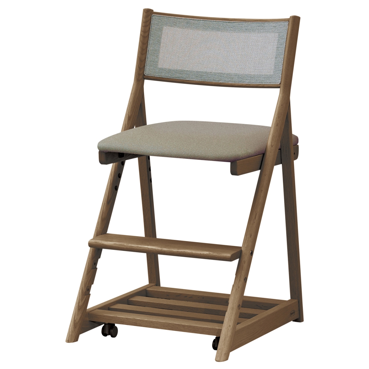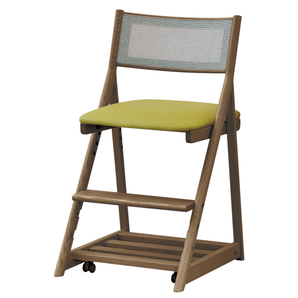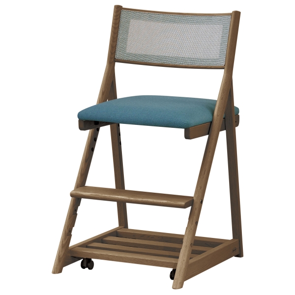 座面は4段階に高さを調節できます。座面の張地はダイニングチェアでも使用している汚れに強い合成皮革よりお選びいただけます。万が一、お子様が汚してもメンテナンスは簡単です。座ると沈み込む安心設計のキャスター付きです。