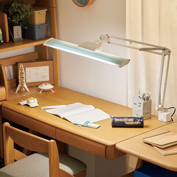 シェードの幅が大きいので、机全体を照らせるデスクライトです。