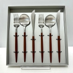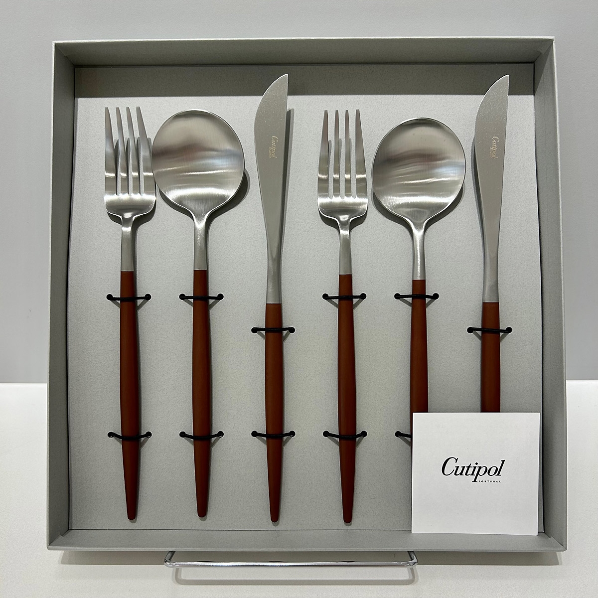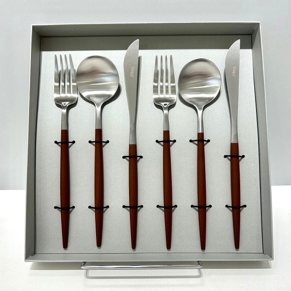 細身で上品なフォルムながら、ブラウンのハンドルが利いている、ポルトガル・クチポールのカトラリーシリーズ「GOA」。スタイリッシュにもカジュアルにも、どんなシーンにも対応するデザインです。テーブルナイフ2本、テーブルフォーク2本、テーブルスプーン2本が入ったセットです。グレー地にゴールドのクチポールのロゴが入ったギフトBOX入りです。