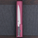硬さの異なるステンレスと高硬度・高炭素のV金10号からなる33層構造により、刃体の表面に木目のように美しいダマスカス模様が広がります。貝印が長年の刃物作りで培ってきた刃付けの技術と、高硬度・高炭素のV金10号を芯材に採用することで、鋭い切れ味が永く続きます。鋲を使わず美しく仕上げた積層強化木のD型ハンドルは手に程よくフィットします。