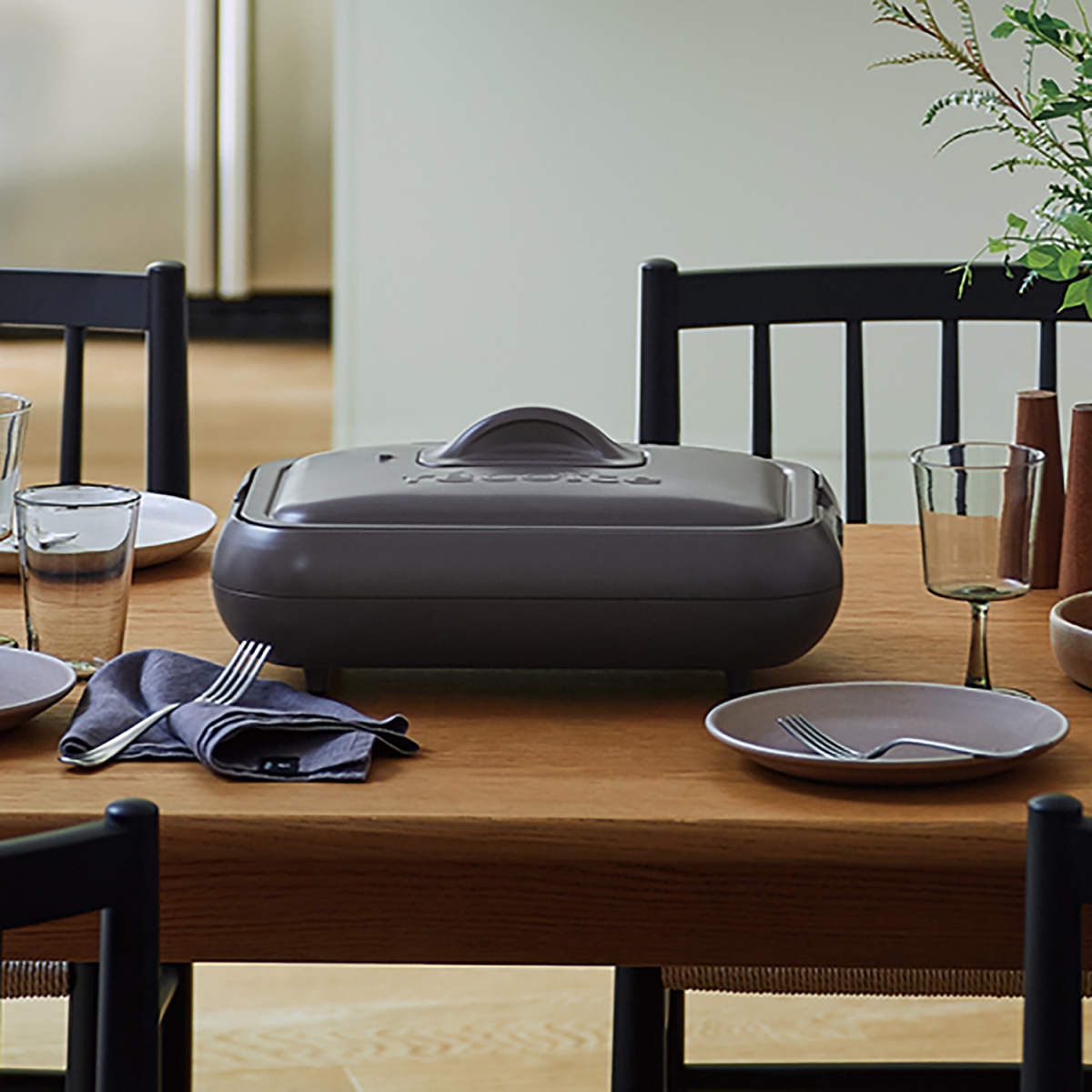 ヒーターをプレートに内蔵したレコルトの[ホットプレート]。ダイレクトに熱を伝えるので、従来のホットプレートに比べて予熱時間も短くなり、ムラのない加熱が可能に。コントローラーを外せばお皿のように丸洗いでき、簡単に後片付けができます。新機能を搭載しながらも “家電”を感じさせないスマートなデザインは、まるで美しい器のよう。食卓で和食器にも洋食器にもすっとなじみ、大切な人と過ごすテーブルクッキングの時間をより楽しく演出します。フラットプレート、タコヤキプレートの2種類のプレートが付属。