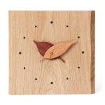 しっかりとした無垢板を、落ち葉のような針が優しい雰囲気にしてくれています。落ち葉(針)は着色しておらず、木本来の色です。赤っぽい長針(分針)はカリンの木、黄色っぽい短針(時針)はケヤキです。時計の機械(ムーブメント)はスイープ型で、秒針がスムーズに動きチクタクという音がしません。