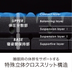 【3×3 Block より高度なクッション性】2つのサスペンションレイヤーを設け、クッション性がさらに向上した特殊立体クロススリット構造。3×3個の点による凹凸構造のブロックが、それぞれ独立して体を保持。よりしっかりとボディラインにフィットし、寝返りもスムーズ。横向き寝にも対応します。