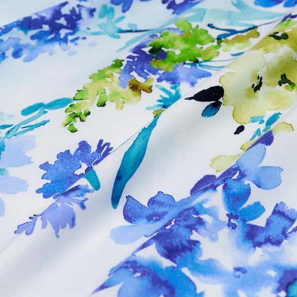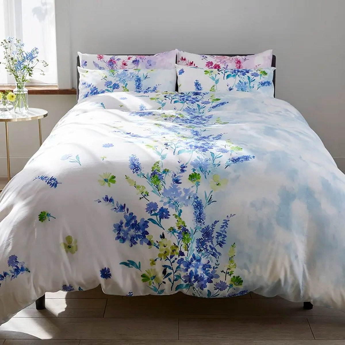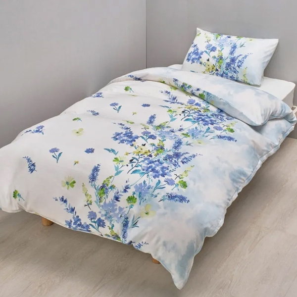 【リヨセル生地の掛けふとんカバー】水彩タッチのフラワーデザインと、揺らぐ光のようなグラデーションのリバーシブル仕様。しなやかな肌触りが人気のリヨセル生地にプリントしました。耐久性と光沢感を兼ね備えたリヨセルは、計画植林されている成長の早いユーカリのパルプを原料としているので、環境負荷を軽減し、地球にやさしい素材です。