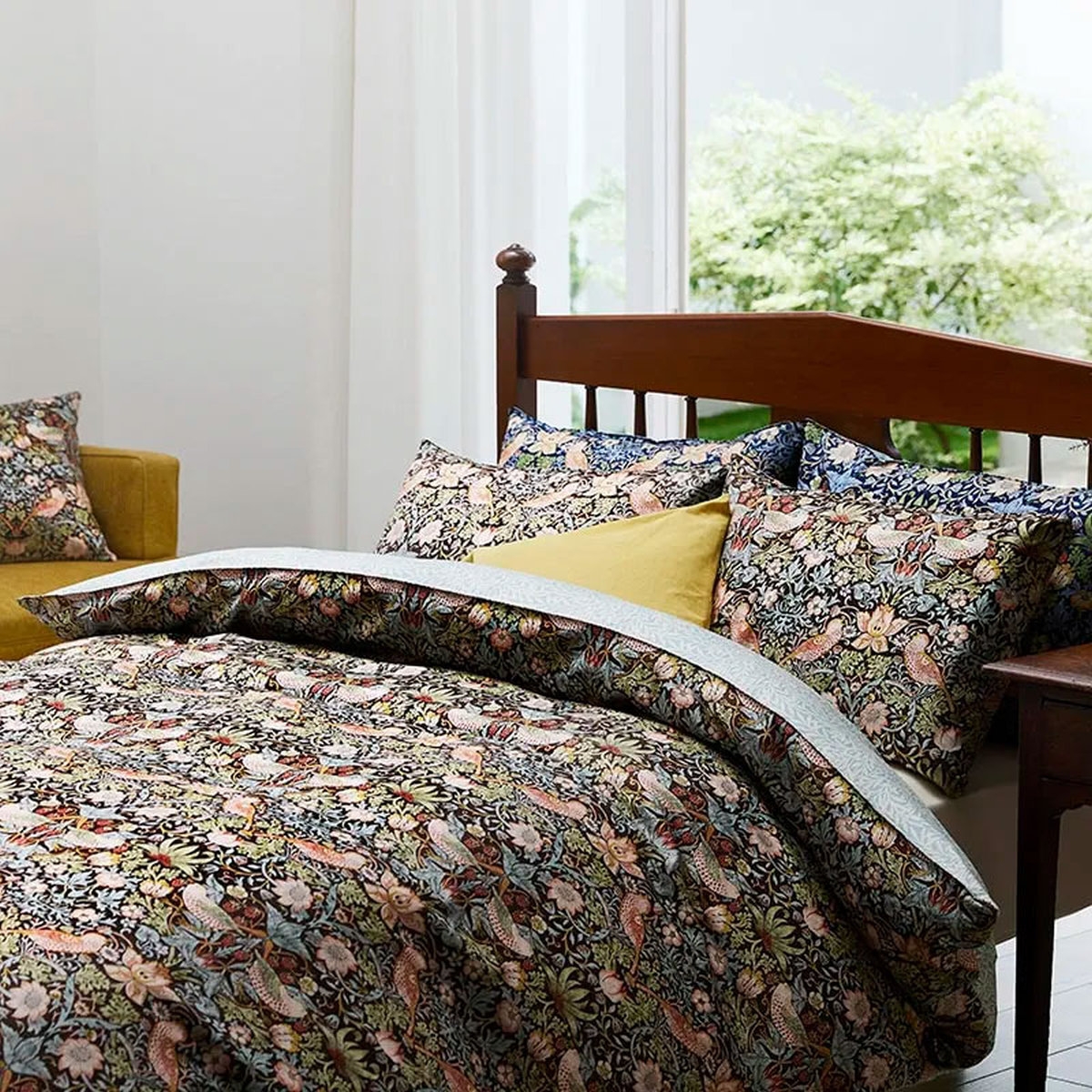 【いちご泥棒柄】1983年にウィリアム・モリスが内装用ファブリックとしてデザインしました。モリスの代表作のひとつであるこの図案はモリスの別宅であった、ケルムスコット・マナーのお庭でよく見かけられたいちごをついばむツグミがモチーフとなった愛らしいデザインです。