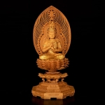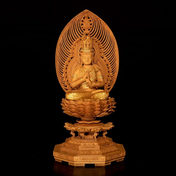 縁起の良い八角台、雲光背(雲の隙間から太陽の光がさす)付の、やさしさと気高さを持つ大日如来像です。截金塗装が施されており、お家のご本尊としてふさわしいただづまいです。