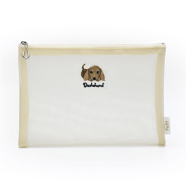 ダックスの刺繍が入った メッシュポーチ「中身が見えるので大変便利」と販売開始から大変人気です。化粧品、文房具、通帳、エチケット用品、マスクケース、マスク 入れ等幅広い用途でお使いいただけます。マチがなくかさばらず、だけれど大きめでしっかり入るサイズ。ひとつひとつ丁寧にワンポイント刺繍を施した、日本製の丈夫でどんなシーンにも使えるメッシュポーチ。プレゼントとしても大変喜ばれる一品です。