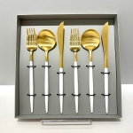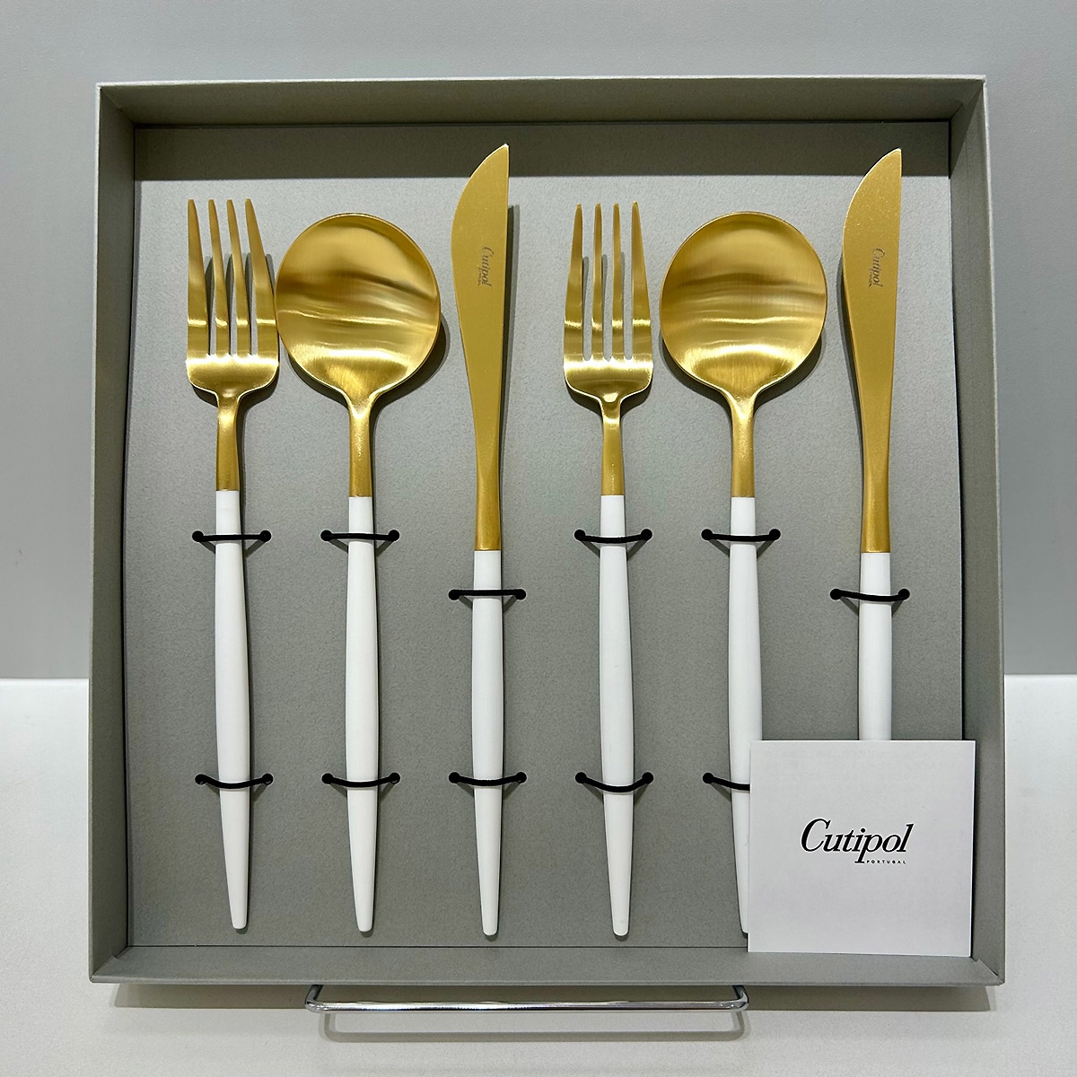 細身で上品なフォルムながら、ホワイトのハンドルが利いている、ポルトガル・クチポールのカトラリーシリーズ「GOA」。スタイリッシュにもカジュアルにも、どんなシーンにも対応するデザインです。テーブルナイフナイフ2本、テーブルフォーク2本、テーブルスプーン2本入り。グレー地にゴールドのクチポールのロゴが入ったギフトBOX入りです。