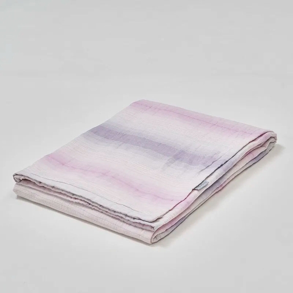 【近江ちぢみを使用した肌掛けふとん 朝影(あさかげ)】麻織物の伝統産地・近江で作られた「近江ちぢみ」を使用。綿と麻を使用した生地は柔らかな肌ざわりと、通気性、発散性に優れています。初夏の明るい朝の光が琵琶湖の深い色の水面に輝く時をイメージし、グラデーションで表現しました。詰めものにはレーヨンと麻の混綿を使用。蒸し暑い季節でも快適にお使いいただける肌掛けふとんです。