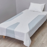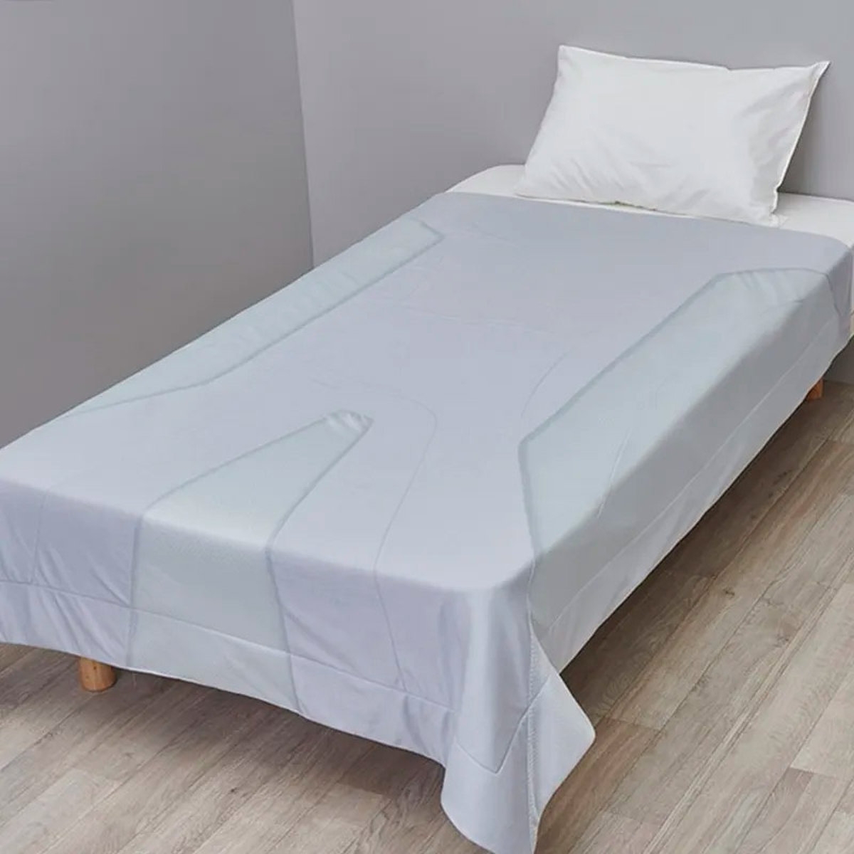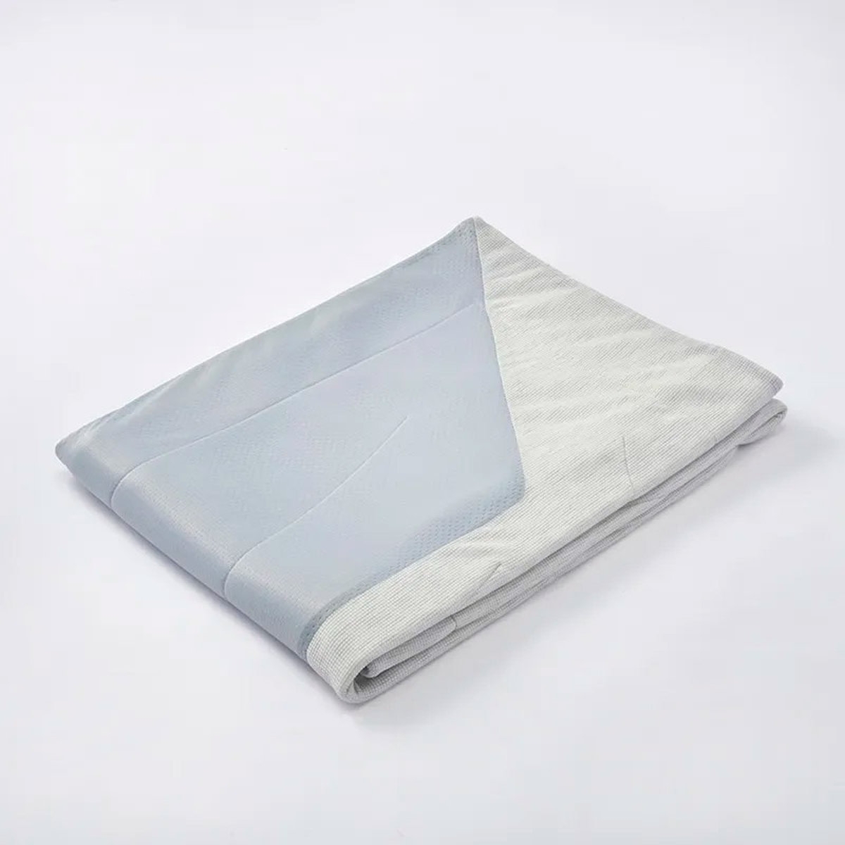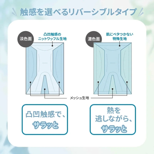 【サラッと×吸水速乾 2つの素材が気持ちいいケット】仰向け寝の脱力しリラックスした状態の脚の開きに合わせた特殊キルト。中わたを使用しないハニカムメッシュ内臓で空気が通り抜けるような構造。片面はサラッと生地、もう片面には吸水速乾のニットワッフル生地使用。温度・湿度に応じて2種類のサラッと感を体感できます。