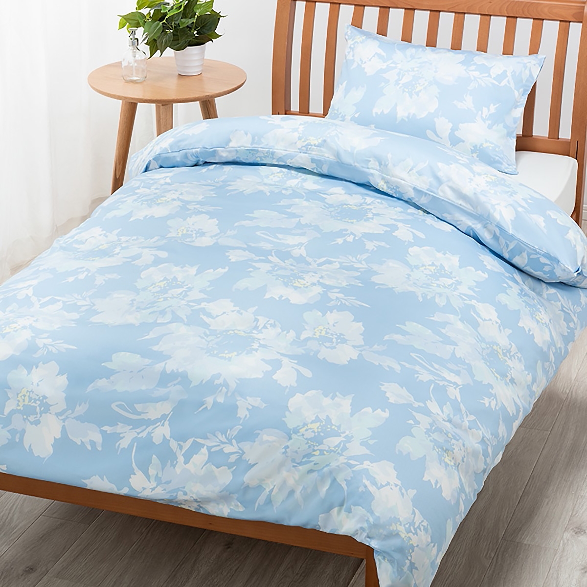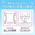 花に落ちる木漏れ日が、きらきらと花びらに影を落としている様子をイメージしたデザイン。【なめらかな肌触りで心地よく】サテン織りの生地を使っているので、肌ざわりがなめらかで柔らか。上品な光沢があります。【ふとんの出し入れが簡単・便利】ふとんカバーの両サイドにファスナーが付いているので、出し入れが簡単。また、おふとんとカバーを結ぶテープにはホックが付いているので付け替えも便利です。【洗濯機で洗える】汚れてもすぐに洗えて、清潔に使えて便利です。