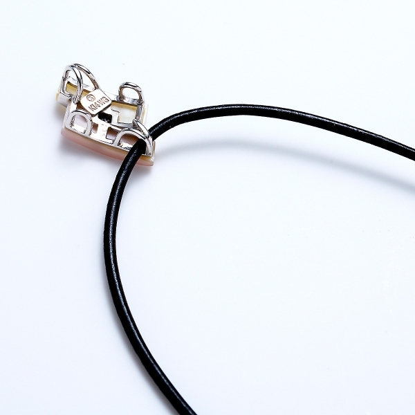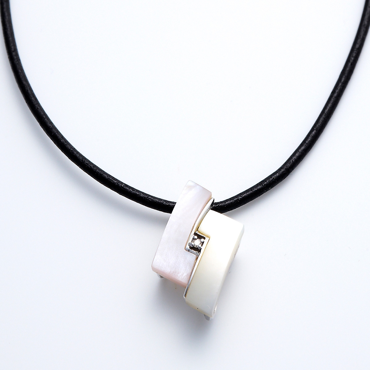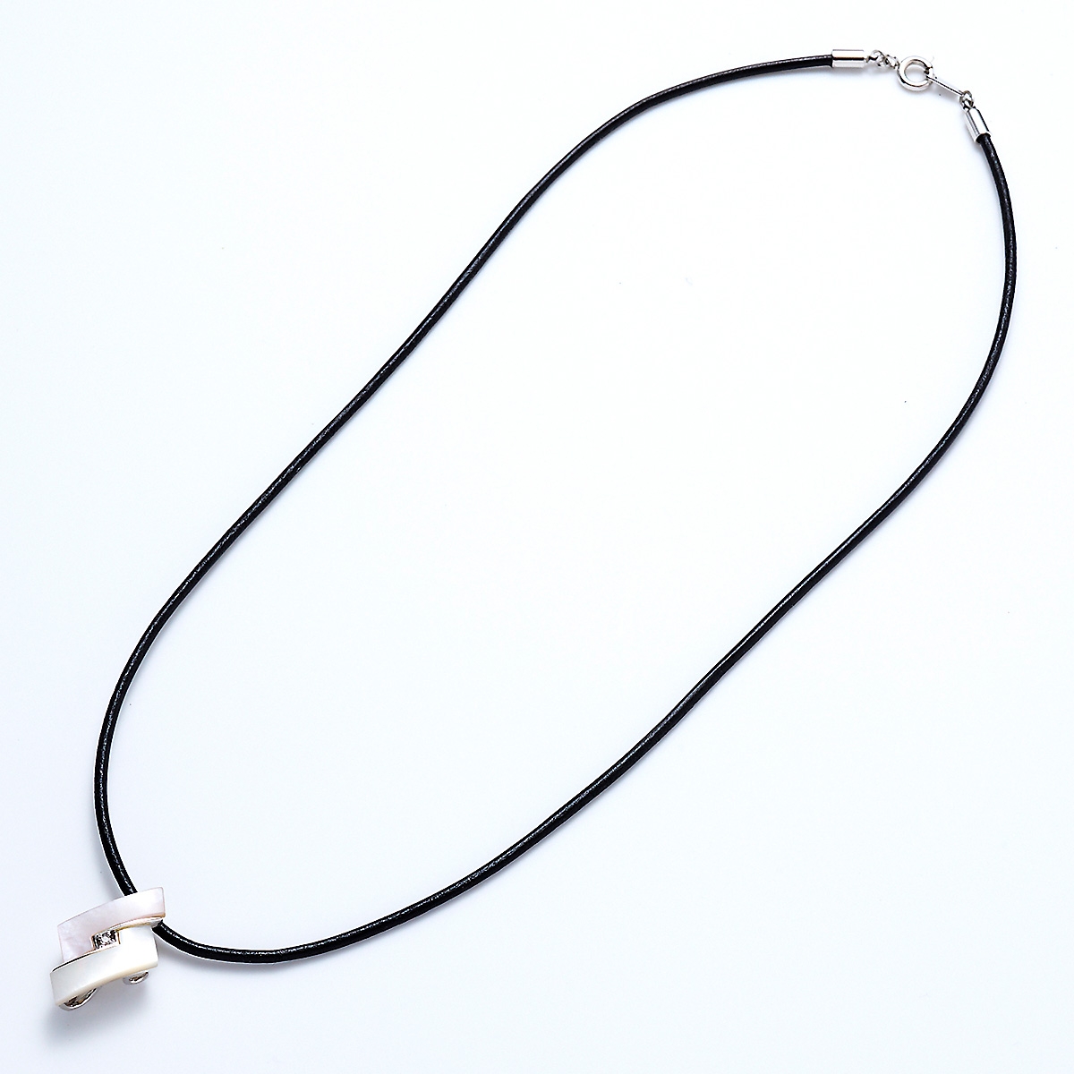 白蝶貝(シロチョウガイ)とダイヤモンドのトップに、革紐を組み合わせたモダンで洗練されたペンダント
