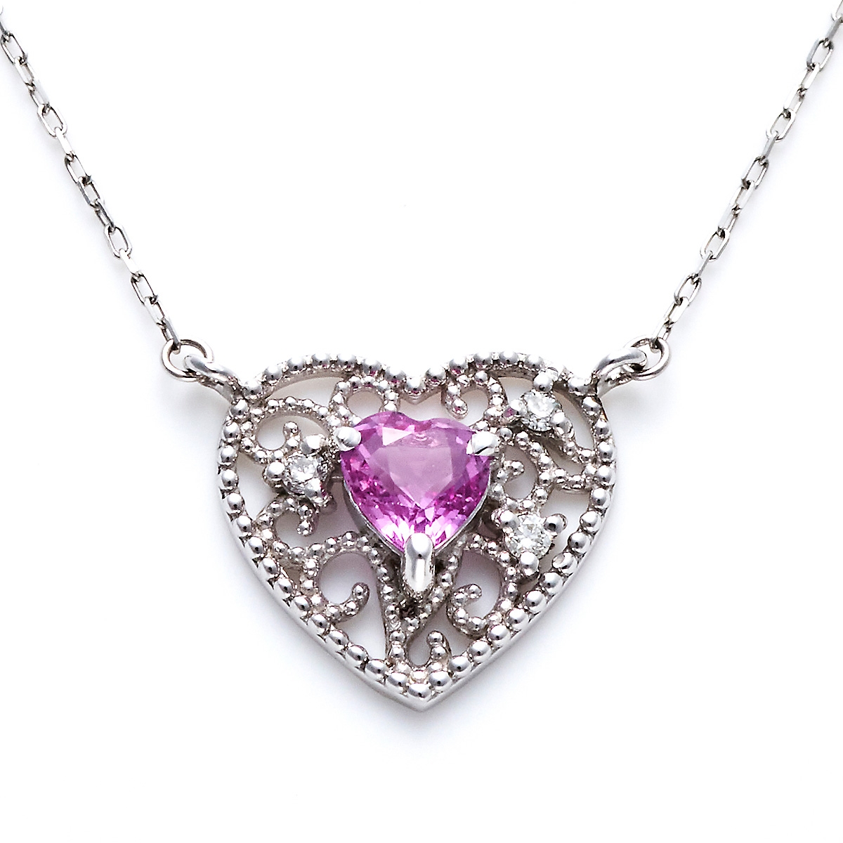 プラチナの凛とした輝きとダイヤモンドが、ピンクサファイヤの甘さを引き締め、上品な胸元を演出します。二つのハートが重なるデザインは、大切な人へのギフトとしても最適です。