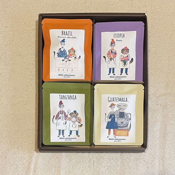 自家焙煎の新鮮な珈琲をドリップパックに包みました。エチオピア、タンザニア、グアテマラ、ブラジルと風味の違う4種のセット。挽き立ての豆をパックしてるので、開けた瞬間新鮮な珈琲の香りが広がります。手軽にご自宅で自家焙煎珈琲店の味が楽しめます。絵本作家さんとのコラボした可愛いパッケージはちょっとしたギフトにも喜ばれる可愛さ。