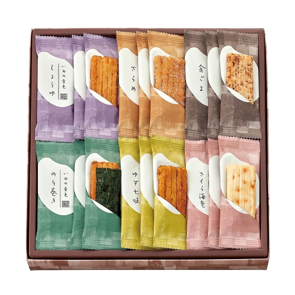 しょうゆ×5、ざらめ×5、金ごま×5、のり巻き×5、ゆず七味×5、さくら海老×5