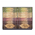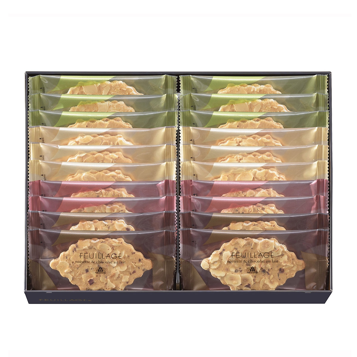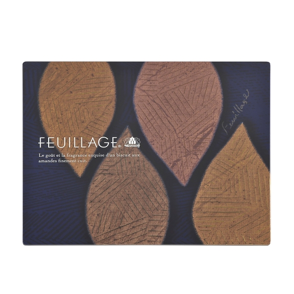 フランス語で「木の葉」を意味するクッキー。スライスナッツをしきつめてパリッと香ばしく焼き上げたクッキーにバランスよくチョコレートをサンドしました。チョコレートはナッツに合わせて相性のよいものを厳選。クッキーとナッツとチョコレート、それぞれの味と食感が繊細に重なり合います。