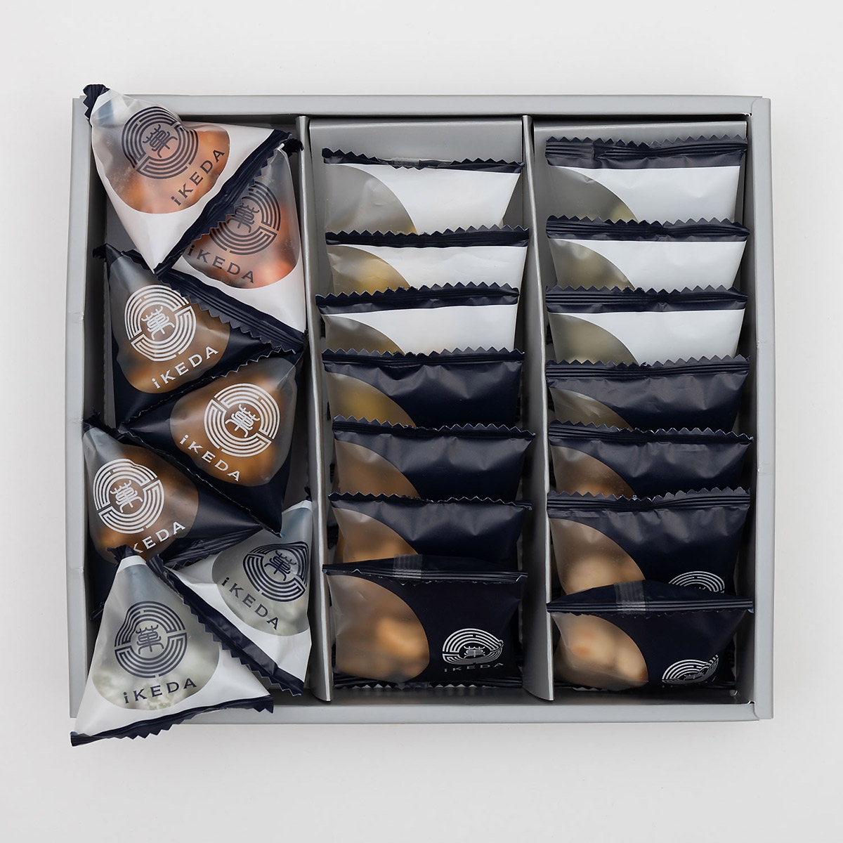 食べきりサイズの個包装セット。人気No.1のしょうゆ味「焼カシュー」、ツンとくる辛さがクセになる「わさびカシュー」、ピーナッツを焼いか入りの衣で包んだ「海鮮まめ焼きいか旨塩」、北海道産とうもろこしパウダーをまぶした「とうきびカシュー」など人気の創作豆菓子を詰め合わせました。ちょっとした手土産にも、自家用にもおすすめです。