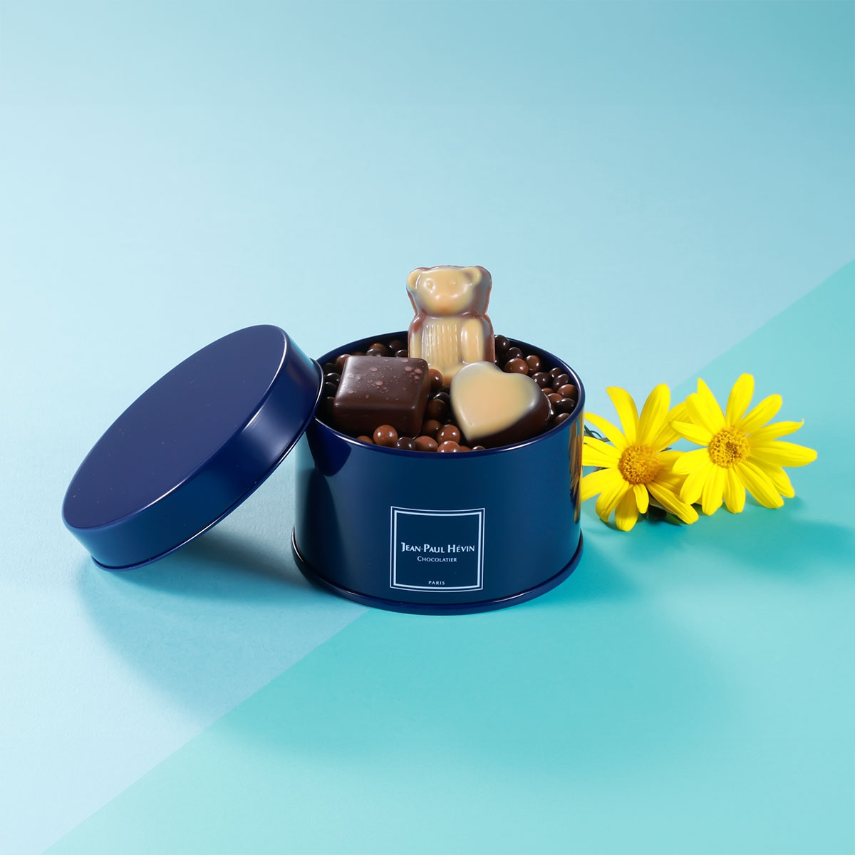 クマの形のショコラ、ハートのショコラ、期間限定のショコラをペルルクラッカントゥと一緒にブルー缶に詰合せ