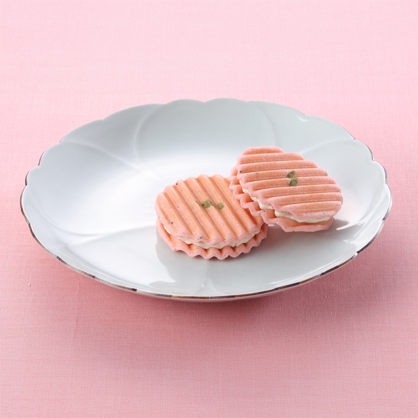 桜葉を練り込んだ歯ざわりの良い桜色の生地で、桜風味のクリームを挟みました。