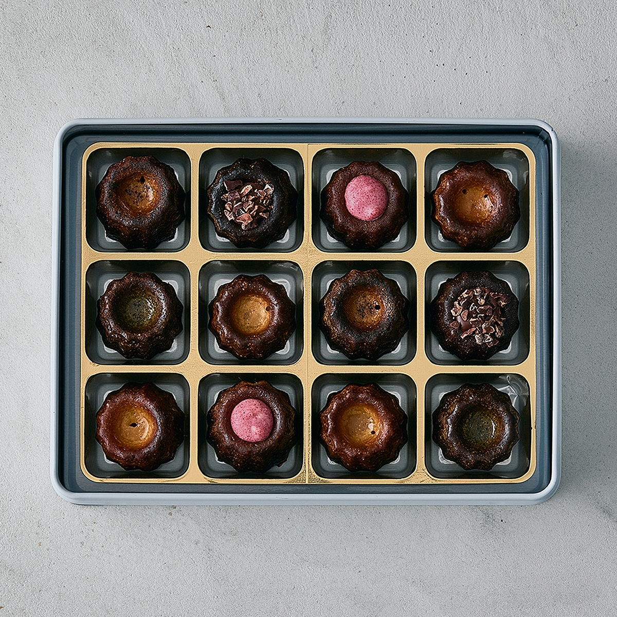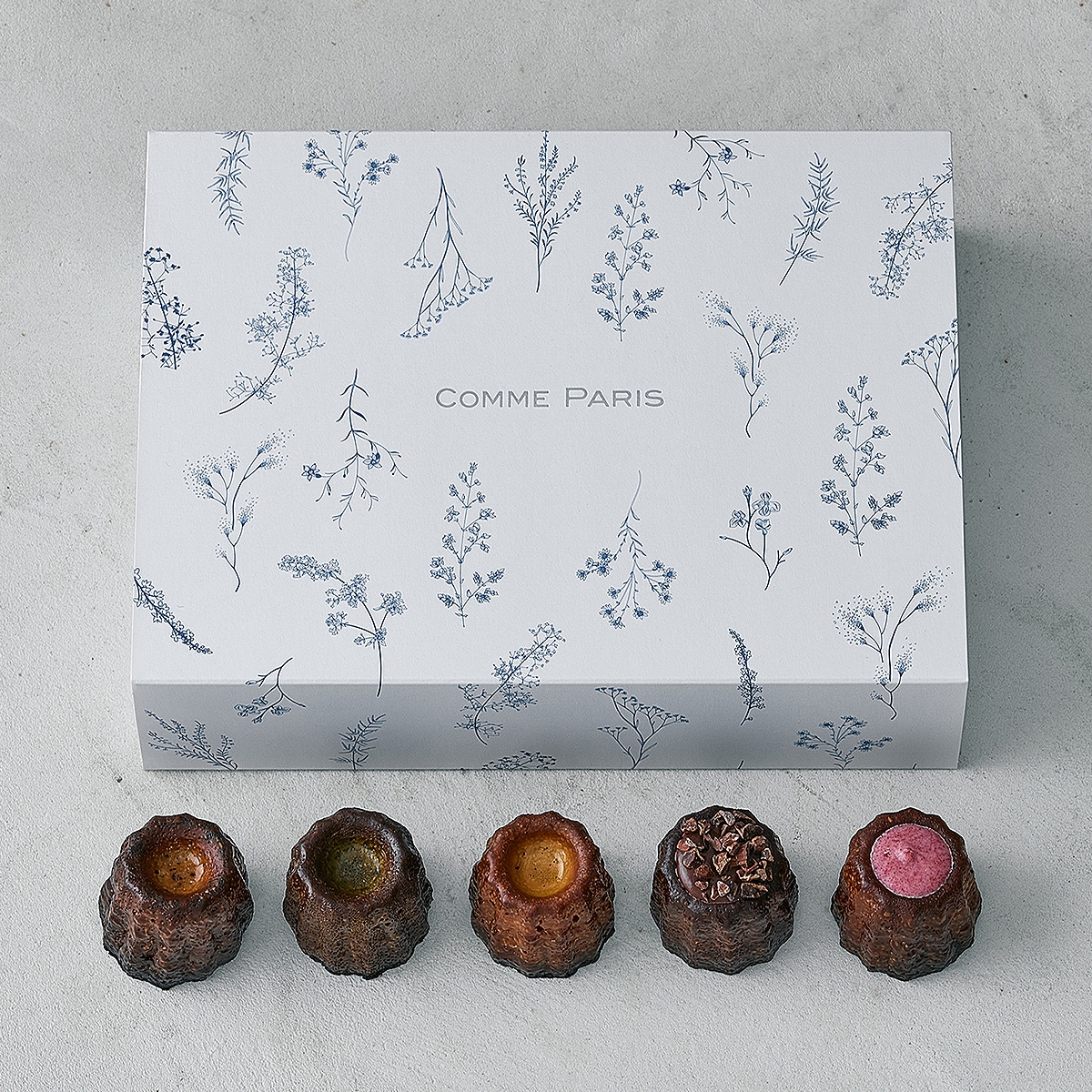 プレーンから、人気のショコラ、いちごカヌレなどを味わえる1番人気の詰め合わせ。5種類全てのカヌレを詰め合わせた宝石箱のようなセットです。
