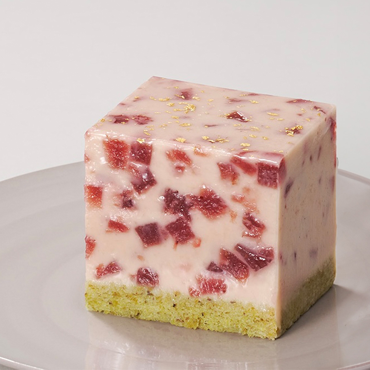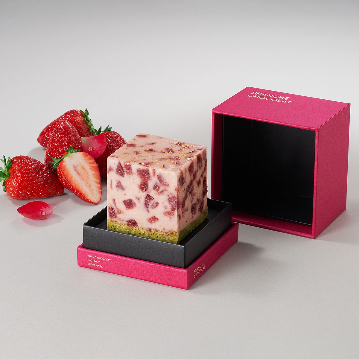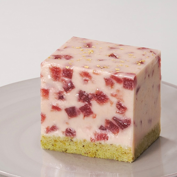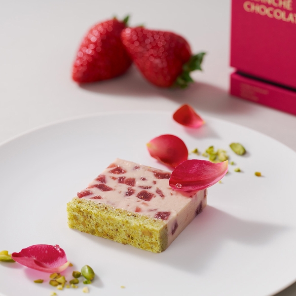数あるブランドから厳選した苺は、奈良県天理市中の井農園が語る「古都華(ことか)」です。風土を考慮した自然な土壌栽培で生産される珠玉の1粒は、豊かな甘味と優しい酸味が特徴。「あのエキゾチックで、バラを思わせる香りが印象的」と語る薬師神シェフが、長年使い続けてきたご縁もあり、最高峰の苺をカレ・オ・ショコラの素材とすることが叶いました。「古都華」特有の香りとリンクするよう選んだのは、埼玉県深谷市にあるROSE LABOが栽培するルージュロワイヤルという品種のバラ。香りを煎じたローズシロップで、いちごのコンポートを作りますガナッシュとなるは、ルビーチョコレートを使うことで自然由来の淡いルビー色に。発酵バターや発酵サワークリームによる心地よい酸味で、上品な甘さに仕立てました。ピスタチオを贅沢に使ったビスキュイの土台が、苺に寄り添います。こんな語りたくなる素材とレシピによって完成したスイーツは、こだわりのある人にこそ贈りたい、記憶に残るギフト。