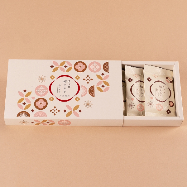 和楽紅屋の和ラスクに、やさしい甘さのホワイトチョコをたっぷり染み込ませました。ミルキーでまろやかな風味が生地に広がり、しっとりやさしい口どけ。冷やして食べると、ほどよい甘さとパリッとした食感が際立ちます。
