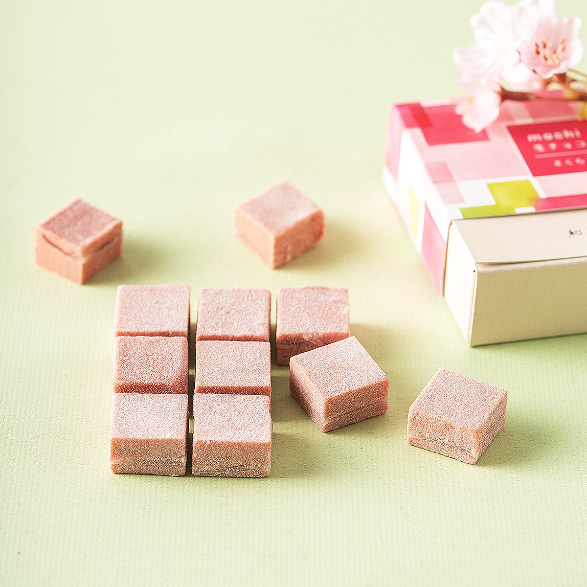 桜の花と葉を苺チョコに合わせ、糀甘酒で熟成させた華やかな桜香るガナッシュともちもちの求肥を愉しむ和楽紅屋の生チョコ。