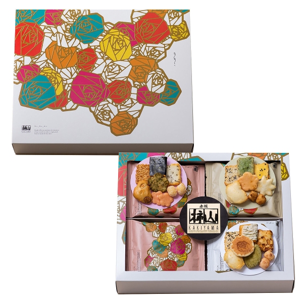 食べきりのひとつつみに個性豊かなあられが3種。バラをモチーフにしたモダンな箱で女性の方へのプレゼントにも喜ばれます。