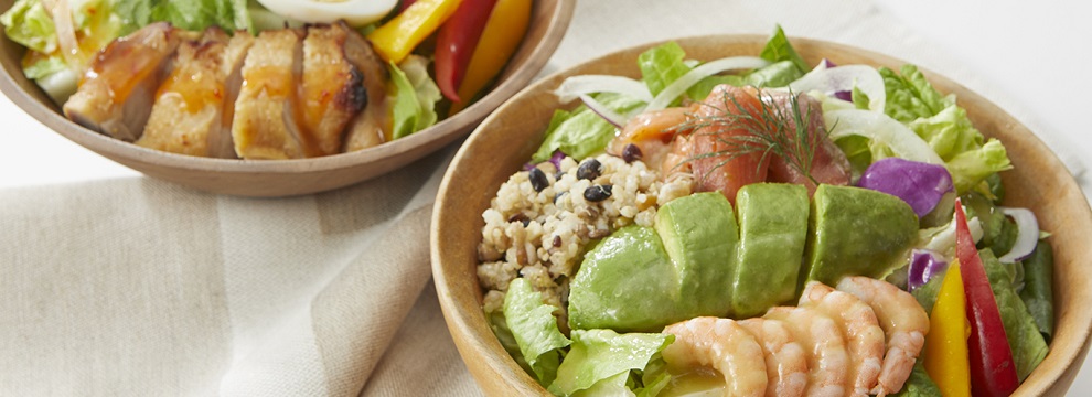 野菜だけでなく魚も肉もしっかり摂れる「主食サラダ」専門店。毎日のサラダをおいしく、そしてヘルシーに楽しんでいただくために自家製のドレッシングにこだわりました。食味や機能など、その日の気分や目的に合わせた「今日のサラダ」が見つかる豊富な種類を用意します。