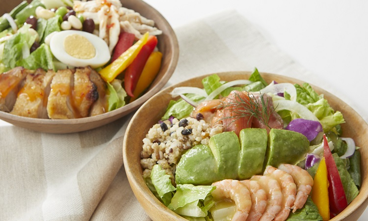 野菜だけでなく魚も肉もしっかり摂れる「主食サラダ」専門店。毎日のサラダをおいしく、そしてヘルシーに楽しんでいただくために自家製のドレッシングにこだわりました。食味や機能など、その日の気分や目的に合わせた「今日のサラダ」が見つかる豊富な種類を用意します。