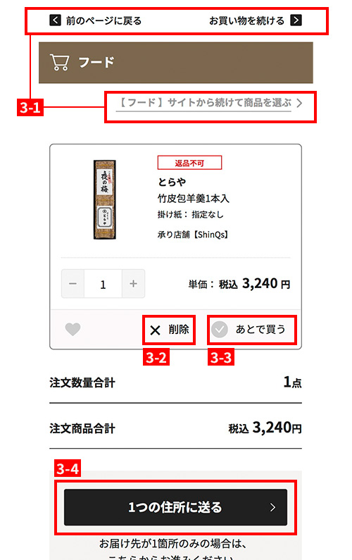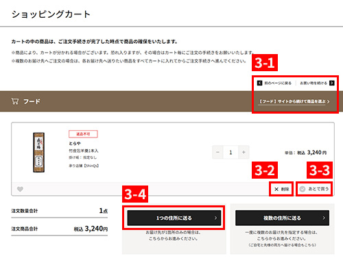 他の商品をさらに追加でご注文する場合は、「前のページに戻る」か「お買い物を続ける」、または「フードサイトから続けて商品を選ぶ」を押し、STEP1から2までの操作でカートに商品を追加してください。