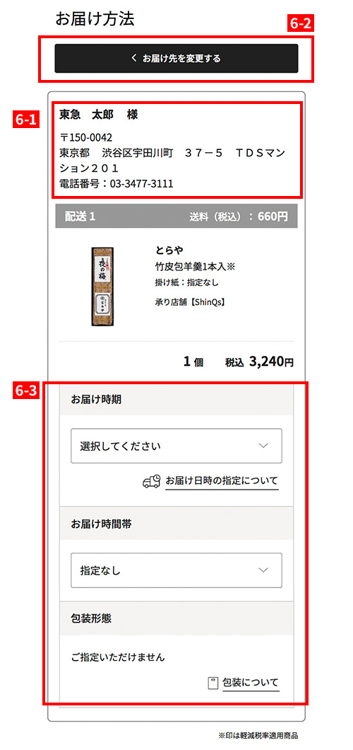 初期設定は、「ご自宅へお届け(東急百貨店オンラインストアにご登録の会員様住所)」となっております。