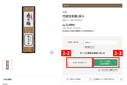 続けて他の商品をカートに入れる場合は「お買い物を続ける」ボタンを押して商品を検索した後、カートに入れてください。